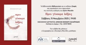 Το Σάββατο 15 Νοεμβρίου 2025 και ώρα 19:00 στο Ίδρυμα «Αιμίλιος Θεοχάρη Καλαϊντζίδης» στον χώρο της Βιβλιοθήκης «Θεοχάρη», το βιβλιοπωλείο Βιβλιογνώση και οι Εκδόσεις Γραφή, σας προσκαλούν στην παρουσίαση της ποιητικής συλλογής του Χρόνη Μουτίδη «Πριν γίνουμε λέξεις» στην Καλλίφυτο Δράμας.