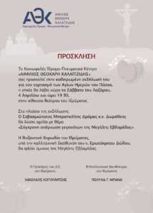 Σάββατο 04 Εκδήλωση για τον εορτασμό των Αγίων Ημερών του Πάσχα Σάββατο 04 Απριλίου 2026 - Σάββατο 04 Απριλίου 2026 19:30 - 21:00 Κοινωφελές Ιδρύμα "Αιμίλιος Θεοχάρη Καλαλαϊτζίδης